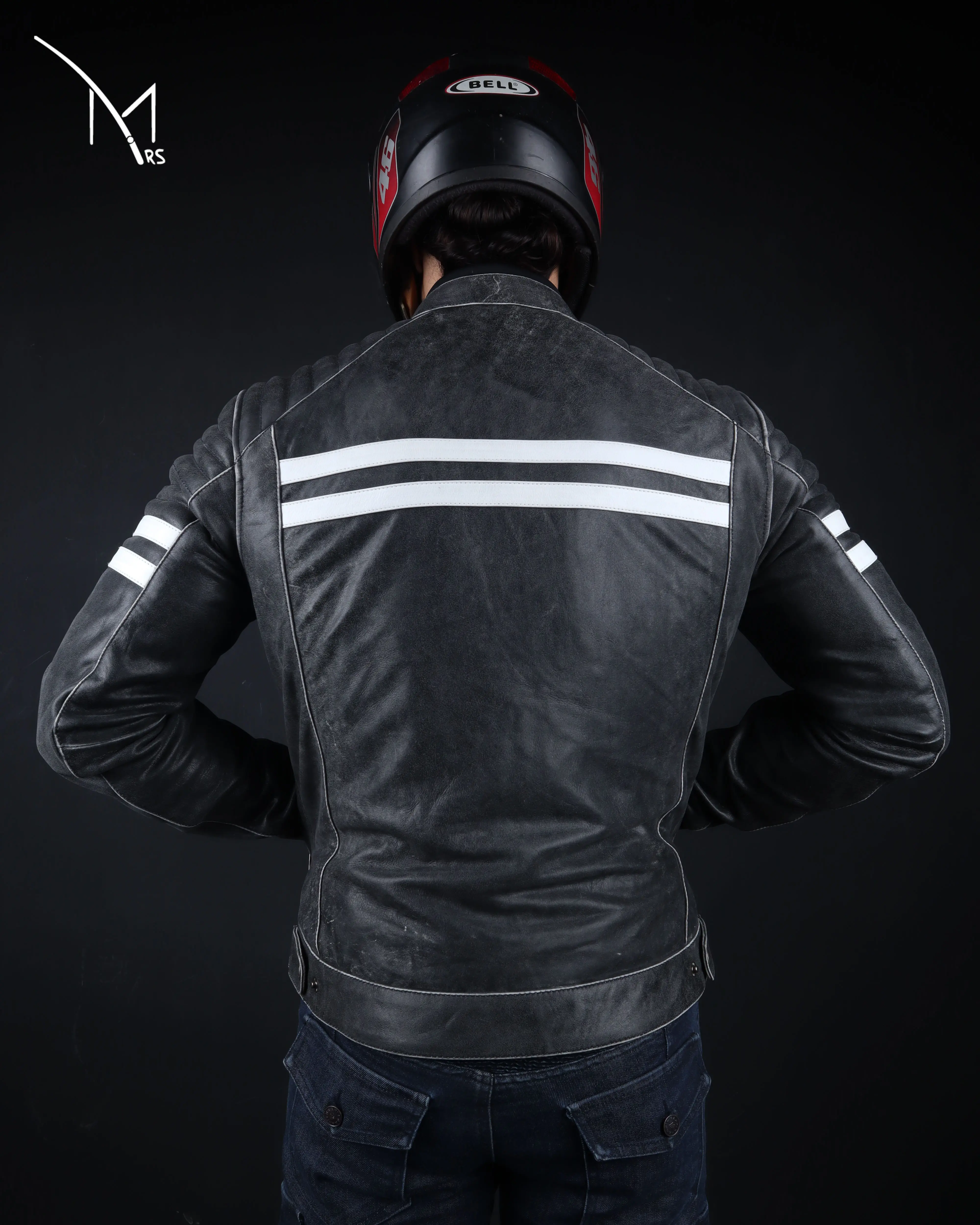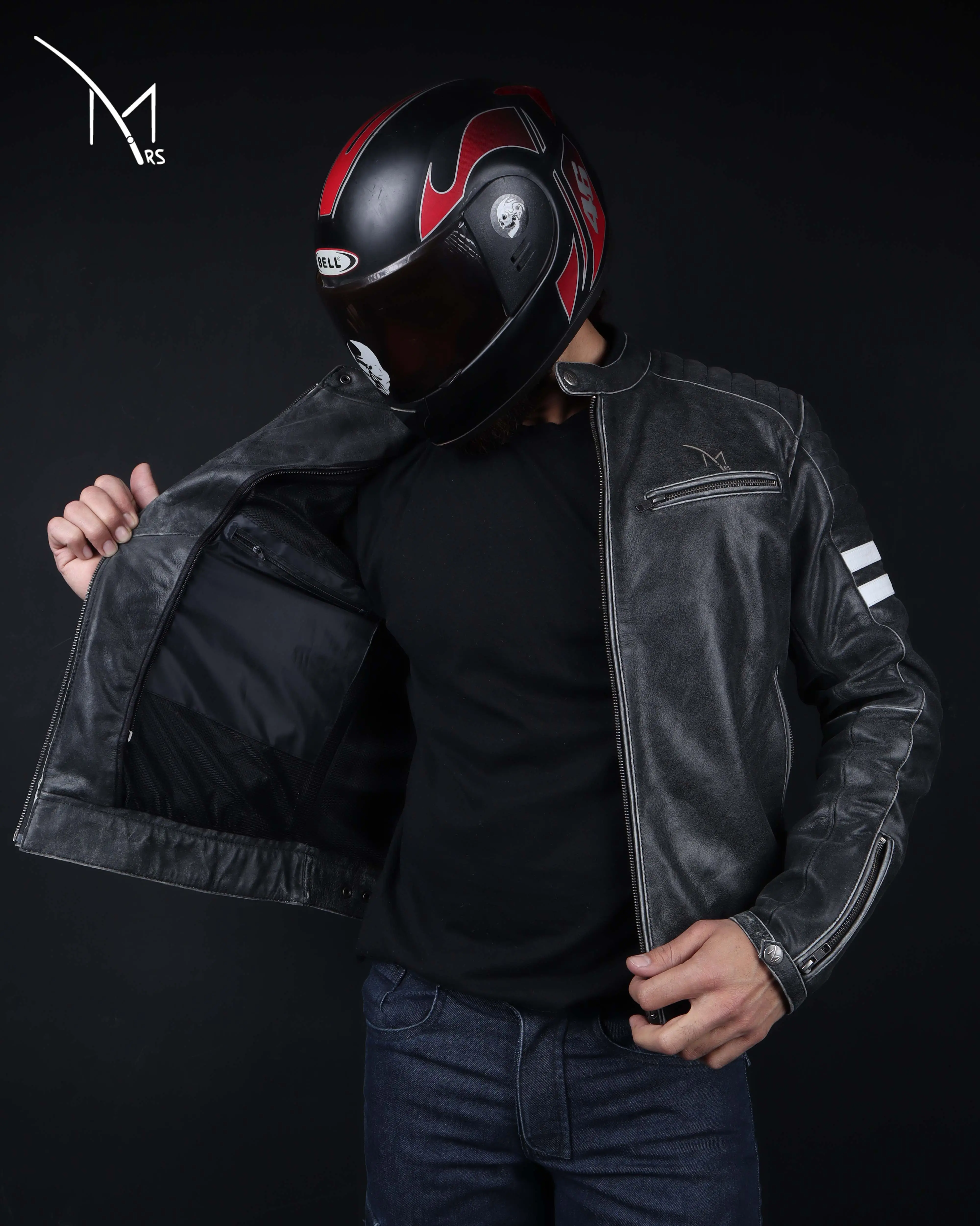 Constructed from 100% Cowhide Cracker Leather, this jacket boasts durability and a distinctive vintage appearance that only improves with age. The outer shell exudes quality craftsmanship, providing both style and protection.