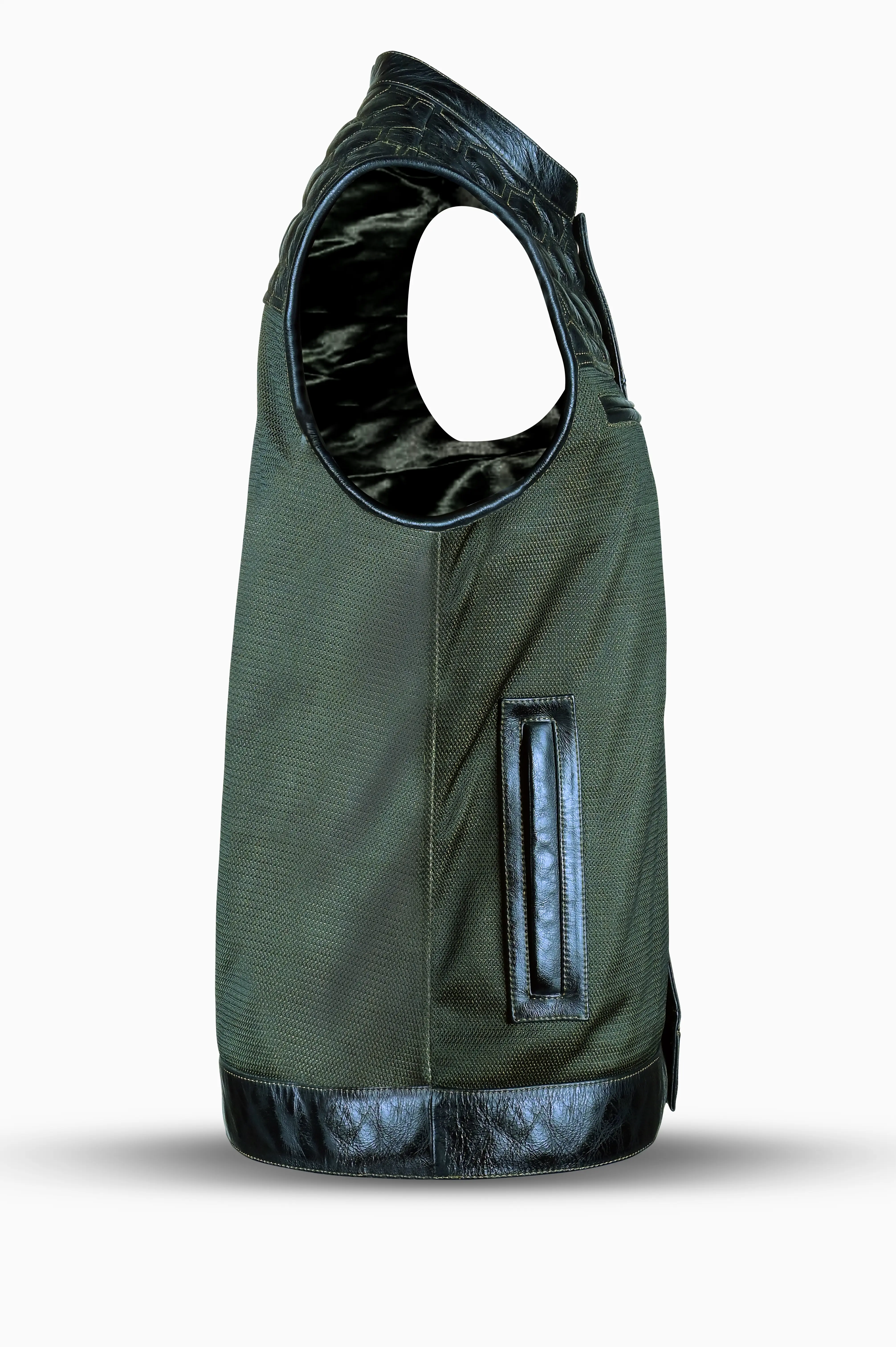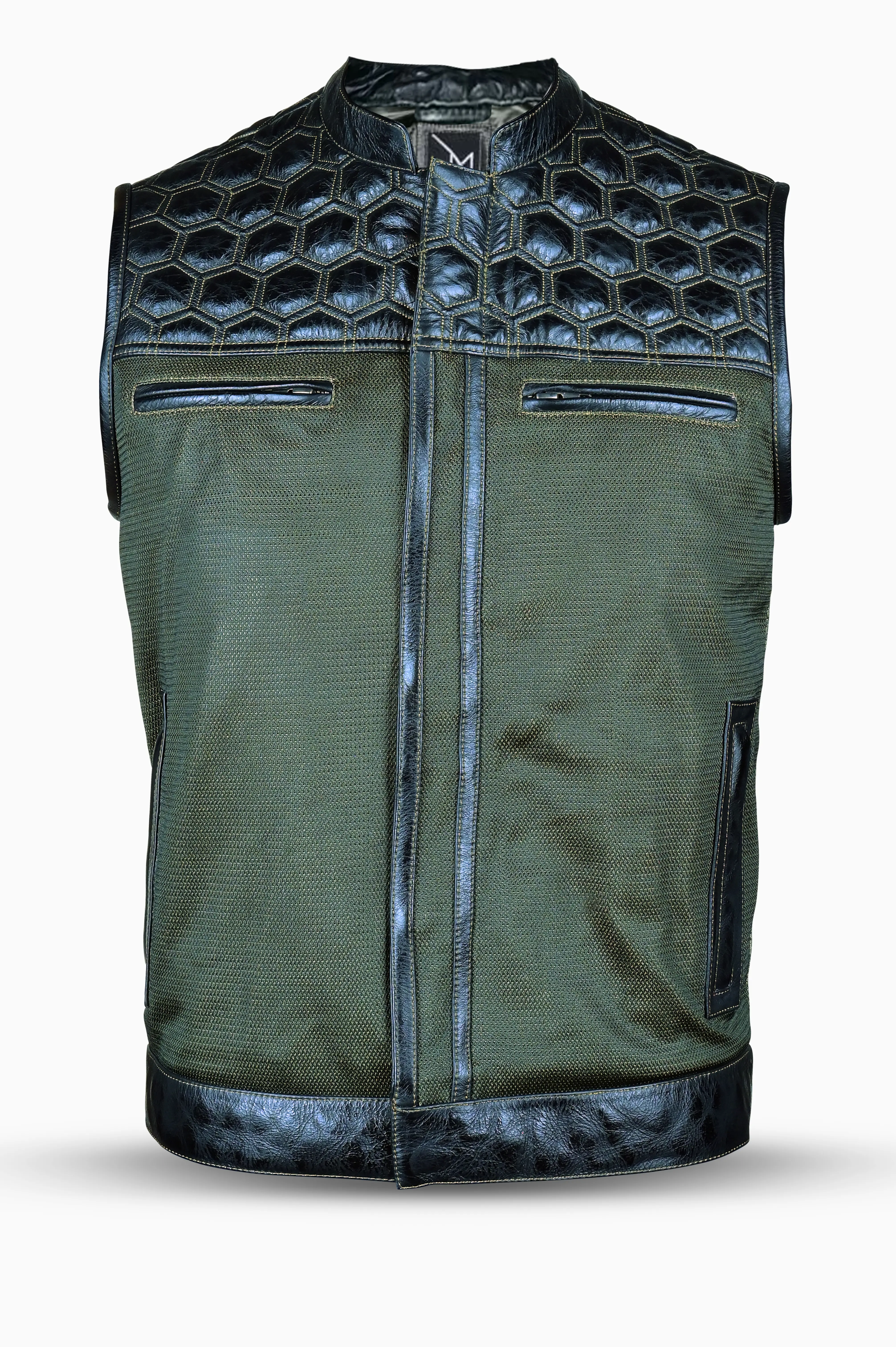 This premium riding vest combines rugged buffalo leather with breathable army green mesh, delivering both durability and comfort. With quilted detailing and functional storage, it’s built for riders who want performance with a bold, stylish edge.