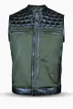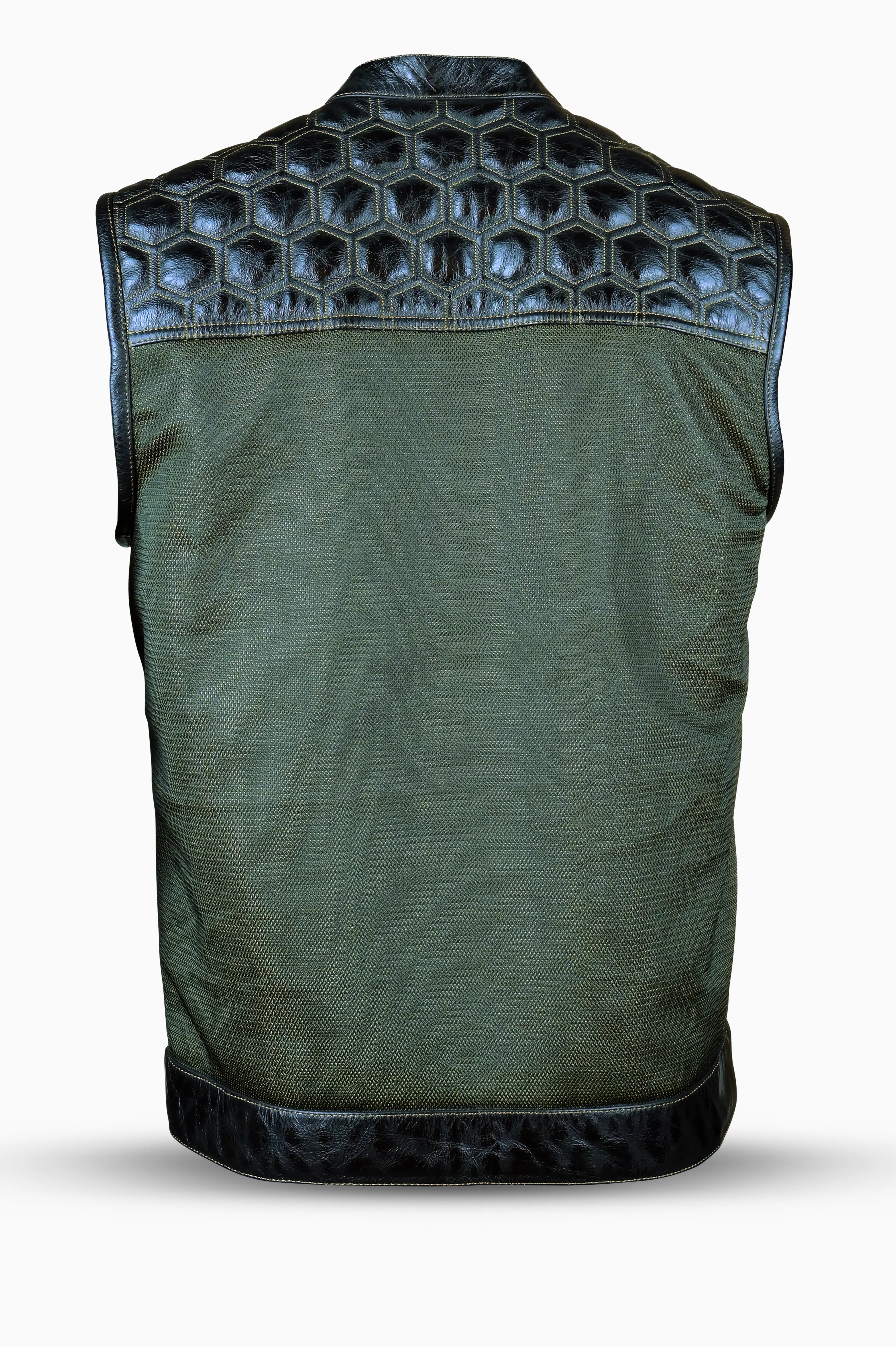 This premium riding vest combines rugged buffalo leather with breathable army green mesh, delivering both durability and comfort. With quilted detailing and functional storage, it’s built for riders who want performance with a bold, stylish edge.