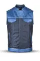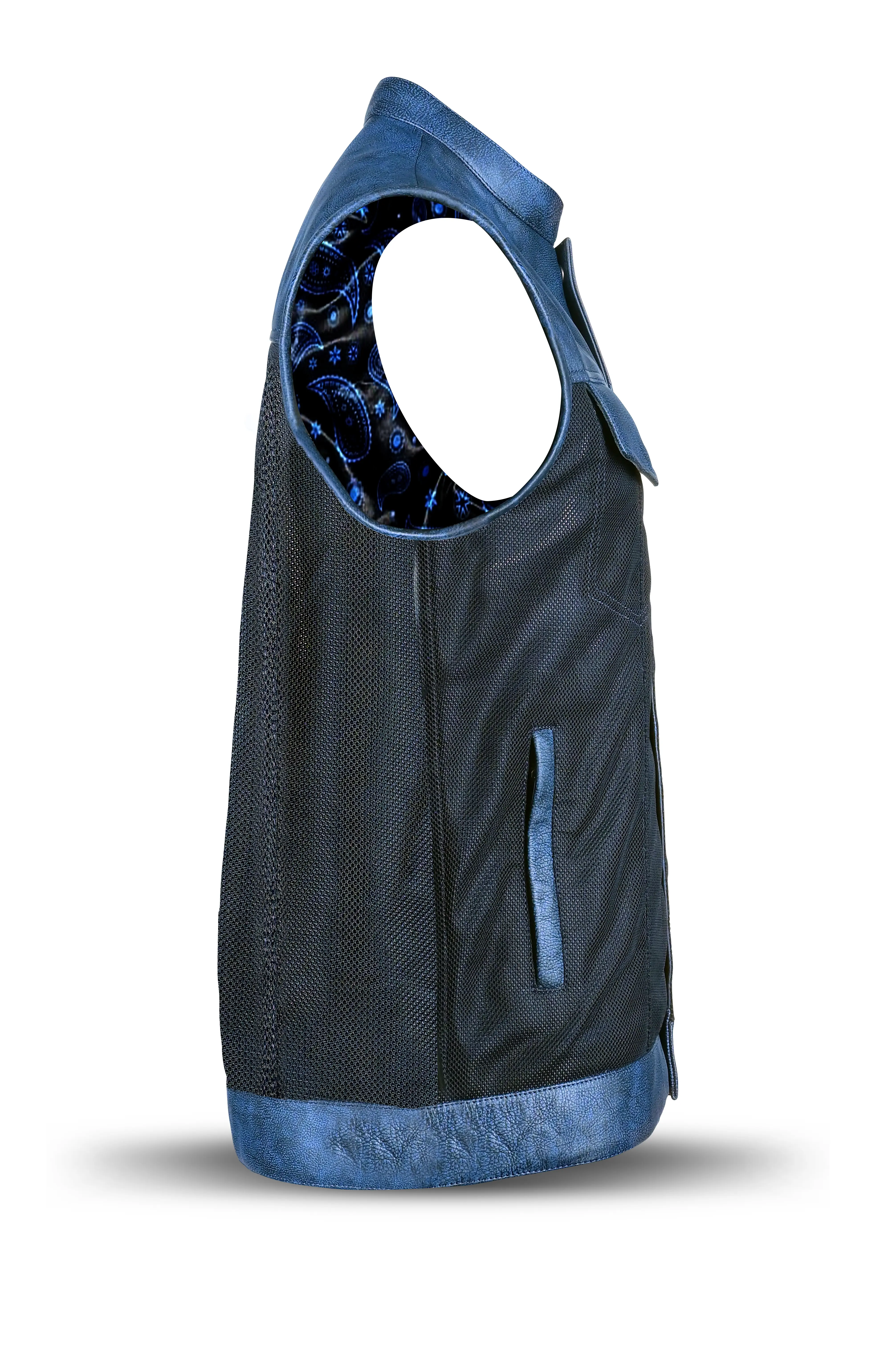 This vest blends bold vintage aesthetics with modern functionality, crafted from premium blue leather with a unique aged effect and breathable black mesh panels. Designed for riders and style enthusiasts alike, it offers durability, comfort, and a touch of timeless character.